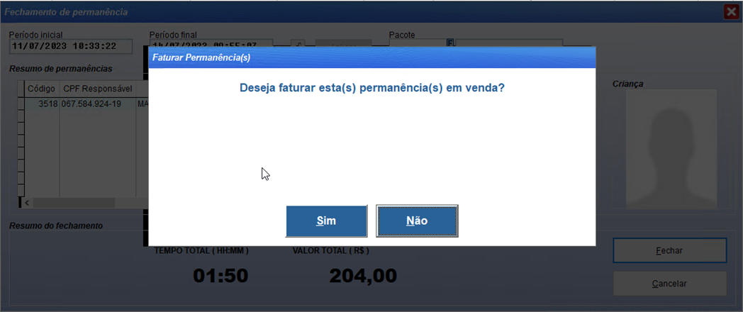 Após finalizar a permanência, será exibido uma mensagem para carregar a permanência em venda e emitir o cupom fiscal.