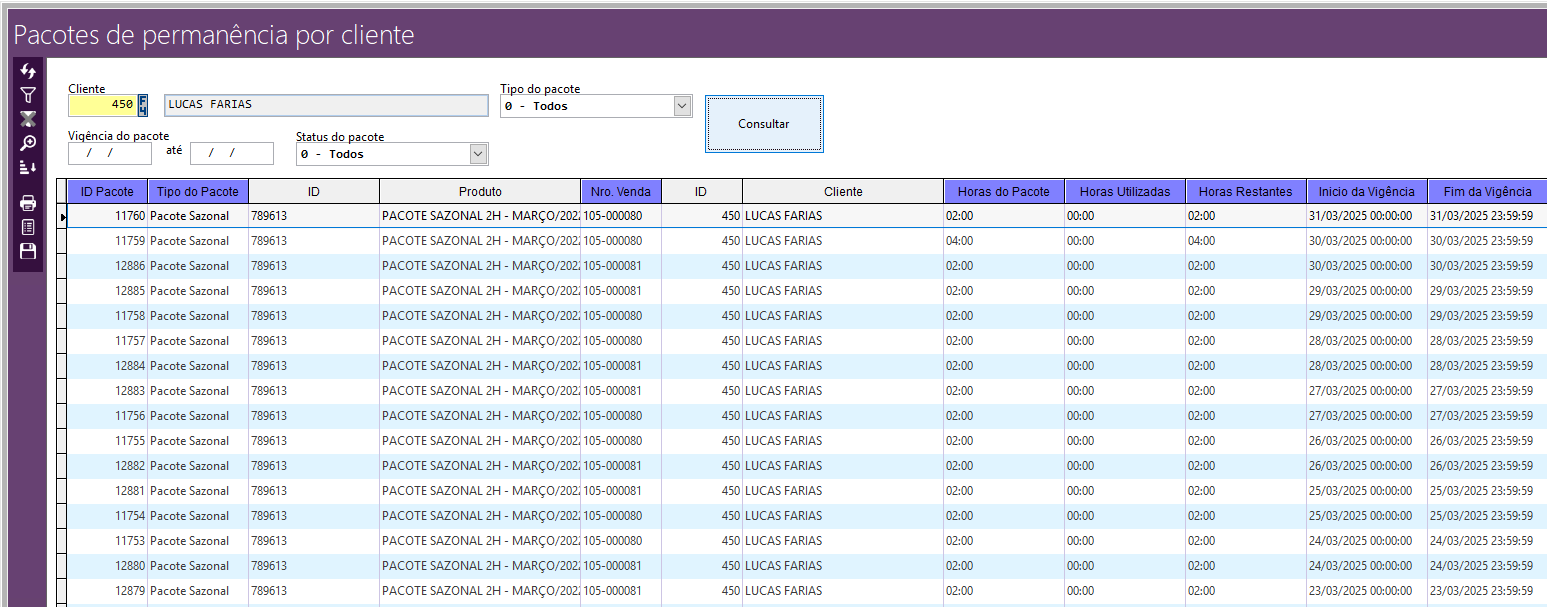 Nesse relatório é possível consultar os pacotes de permanência filtrando por cliente. Além dos pacotes em aberto, podemos também filtrar os pacotes já utilizados.