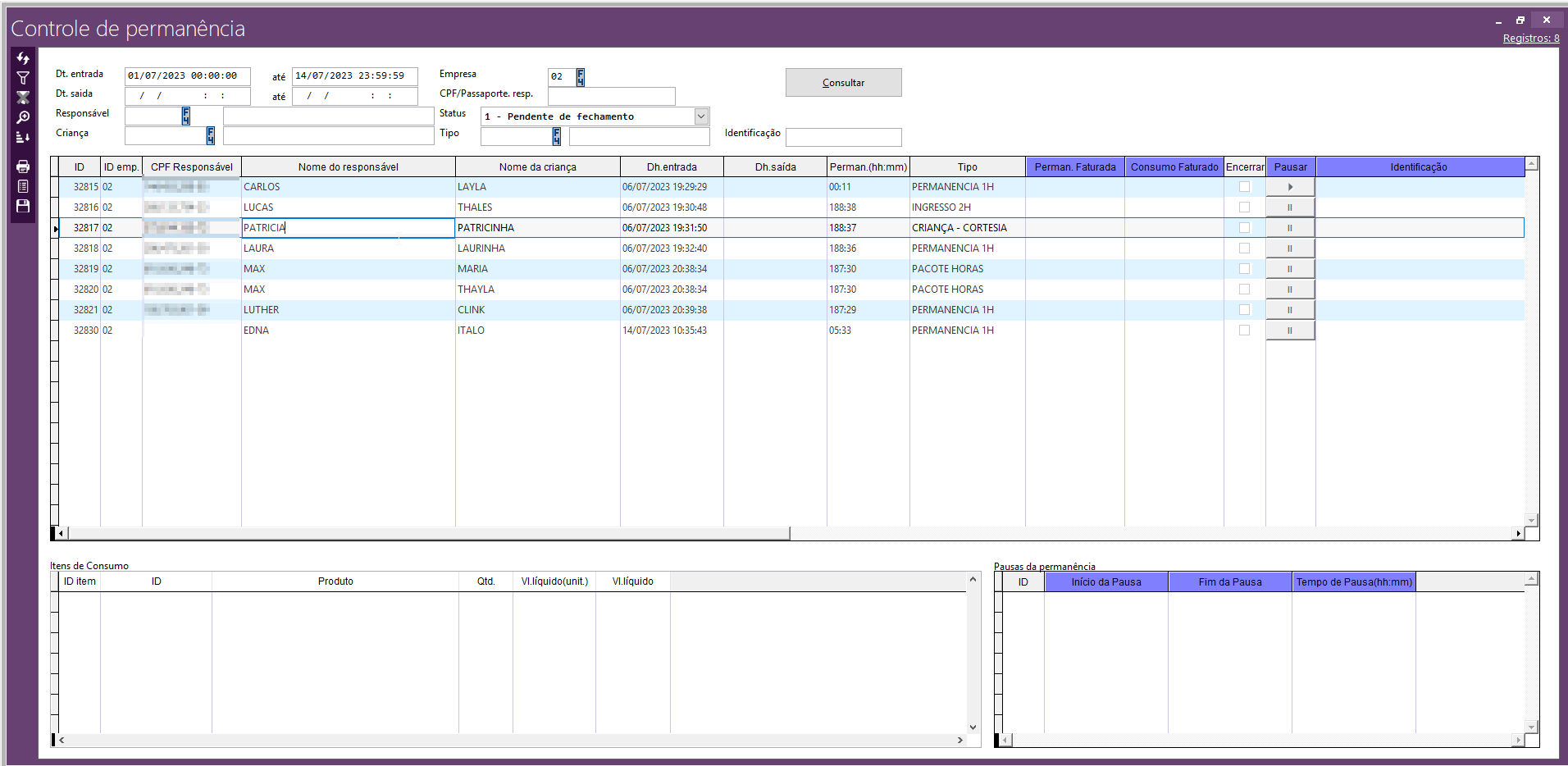 Nesse relatório é possível consultar as permanências realizadas no PDV filtrando por data/horário, nome responsável, nome criança, entre outros.