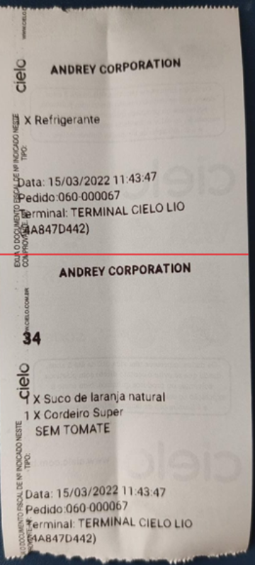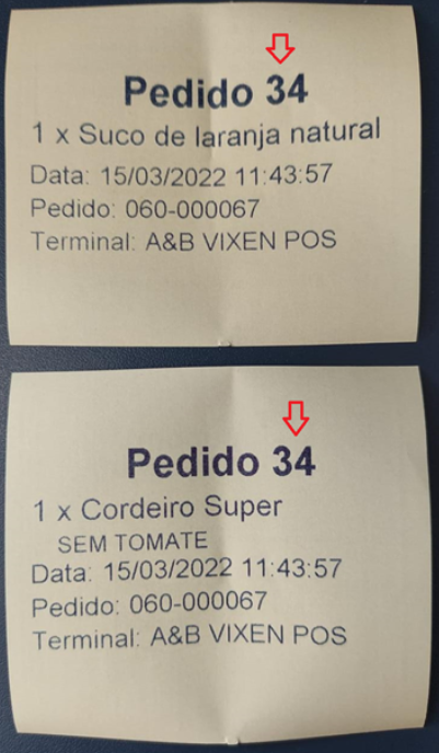 Abaixo podemos notar que foram geradas duas impressões, sendo uma a do vale retirada (refrigerante), e outra do pedido de cozinha n°34 contendo os 2 itens (Suco de Laranja natural e Cordeiro Super):