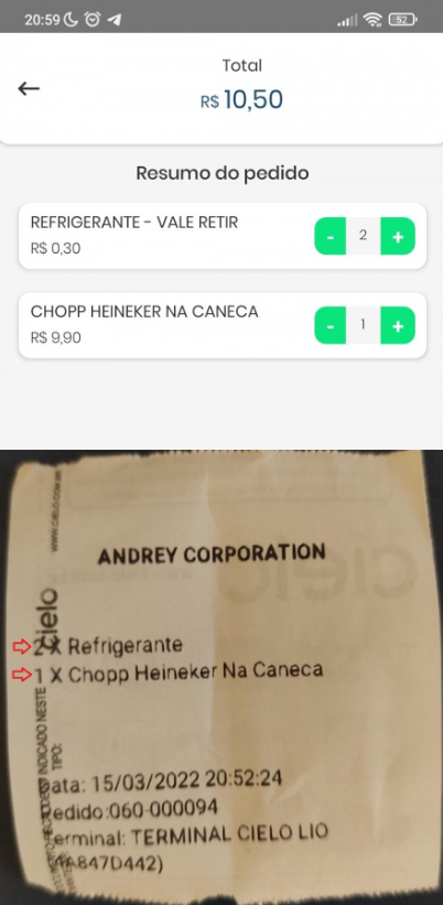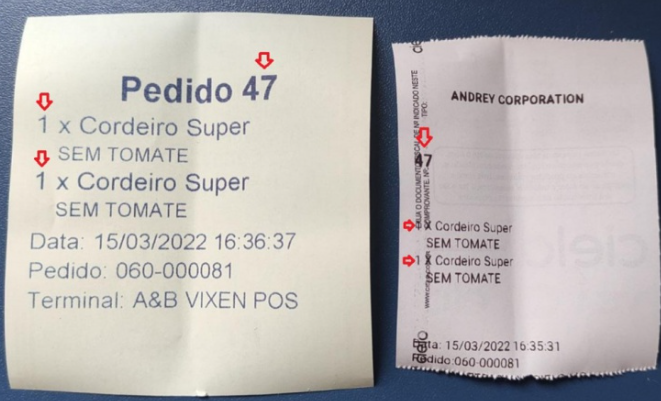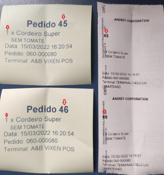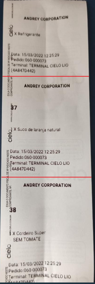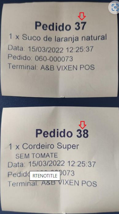 Dessa vez podemos notar que foram geradas três impressões, sendo uma a do vale retirada (refrigerante), e outras duas do pedido de cozinha, sendo o n°37 “Suco de Laranja natural” o n°38 “Cordeiro Super”