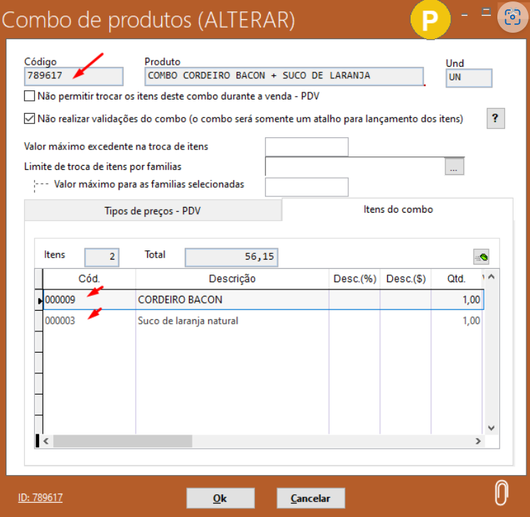 Então se eu realizar a venda com 2 unidades do combo de produtos: 789617 - COMBO CORDEIRO BACON + SUCO DE LARANJA” que possui os itens: