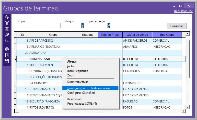 Na tela Retaguarda Parque > Grupos de terminal > Botão direito > Configurar fila de impressão, é necessário cadastrar todos os itens filhos do combo, com o modo de impressão e fila de sua preferência.