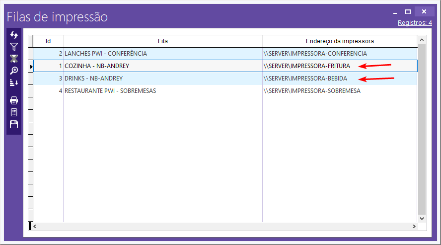 Para os exemplos de impressão que serão mostrados nessa documentação, iremos utilizar 2 Filas de impressão: “DRINKS - NB-ANDREY” e “COZINHA - NB-ANDREY”.
