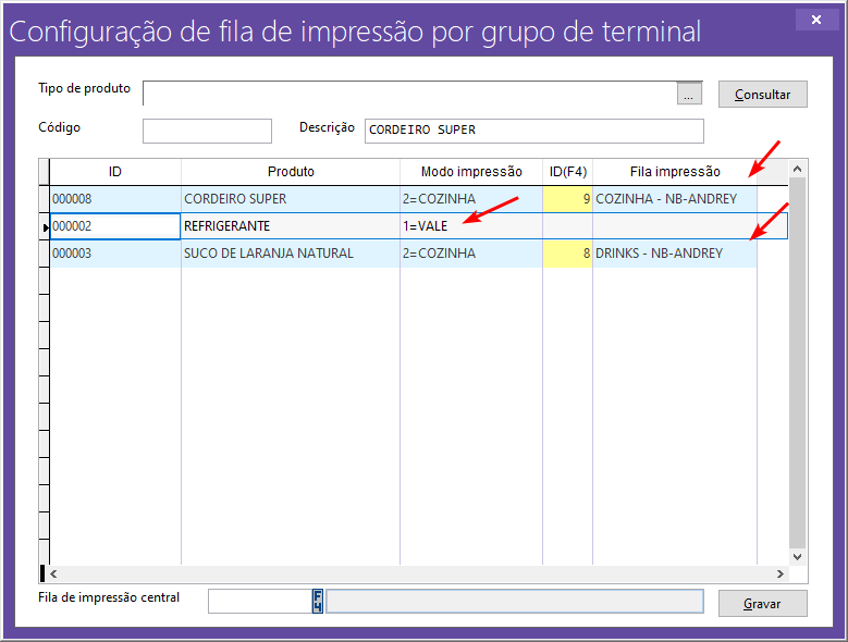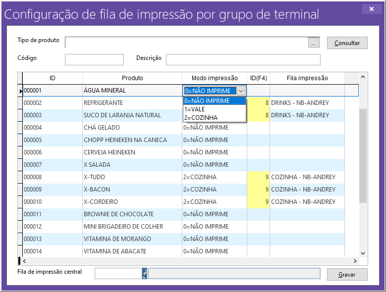 2 = COZINHA; O produto será enviado para o preparo na cozinha, sendo obrigatório selecionar a fila de impressão, que deve estar devidamente cadastrada e configurada, conforme mostrado anteriormente.