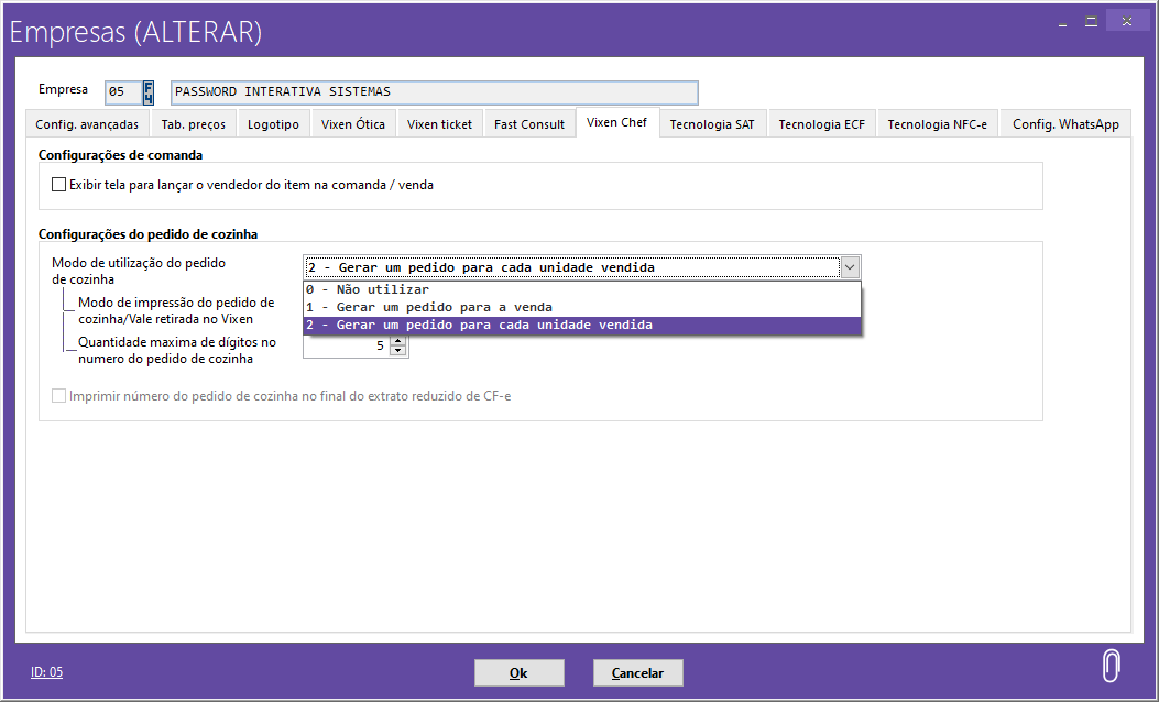 Opção padrão no sistema. Dessa forma, não serão realizadas impressões do pedido de cozinha no Vixen PDV.