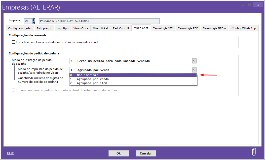 Defina no campo “Modo de impressão do pedido de cozinha/Vale retirada no Vixen”, como serão impressos os pedidos de cozinha / vale retirada no Vixen PDV:
