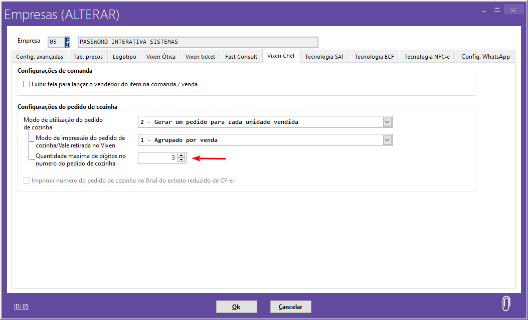 Essa configuração serve para definir a quantidade máxima de dígitos, para geração do número no pedido de cozinha, então se eu definir que no máximo são 3 dígitos, o sistema vai gerar a numeração dos pedidos no intervalo de 1 a 999, e após isso ele vai reiniciar o contador, e começar novamente a partir do número 1.