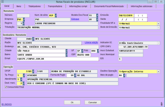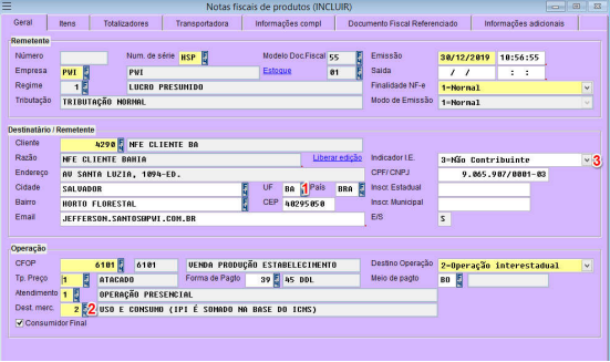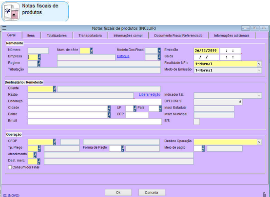 exibirá a tela de Notas Fiscais de Produtos (INCLUIR)