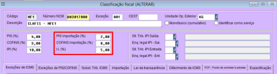 Parametrização da alíquota para cálculo do “imposto de importação” encontra-se
