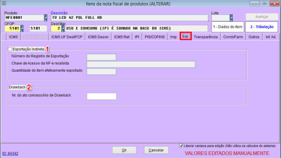 Campos “Exportação indireta” para adicionar dados da nota de exportação; para