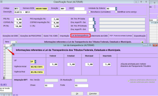 Local para parametrização das alíquotas da lei da transparência na classificação do