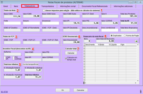 editar manualmente;Totais da Nota: exibe os campos com os valores da nota fiscal;