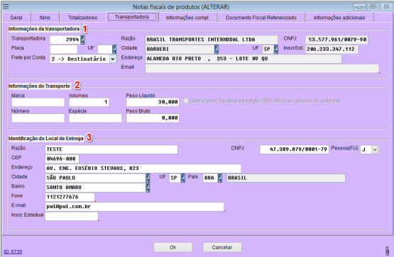1- Campos para informações da transportadora que fará o transporte;