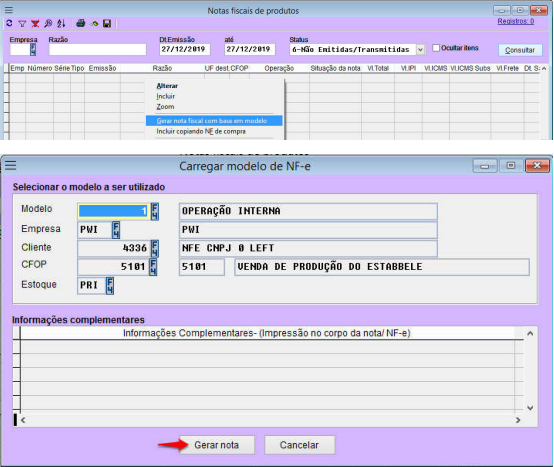 Para gerar uma nota a partir do modelo acesse o menu de contexto das notas ficais de