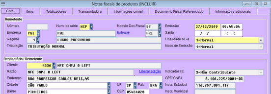 Tela “Geral”: Tela para preenchimento dos dados do remetente, destinatário e das