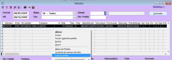 Selecionde o pedido aprovado para faturar e em seguida acione o menu de contexto e