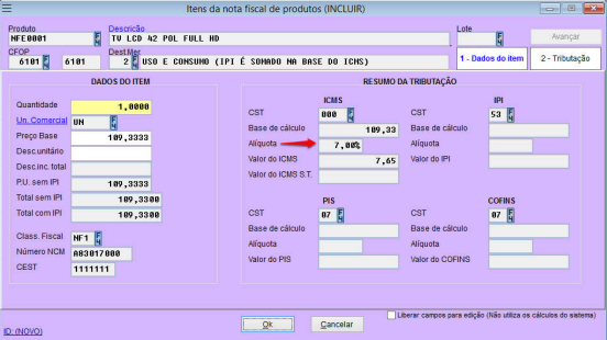 Incluir item na nota: Verificar alíquota de ICMS se carrega a correta ;