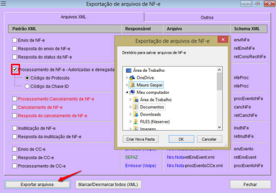 exportar arquivos; selecione uma pasta do diretório para salvar o arquivo XML;