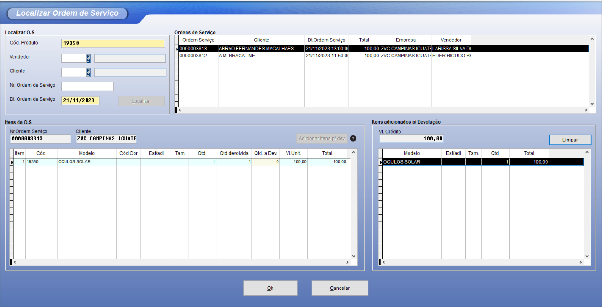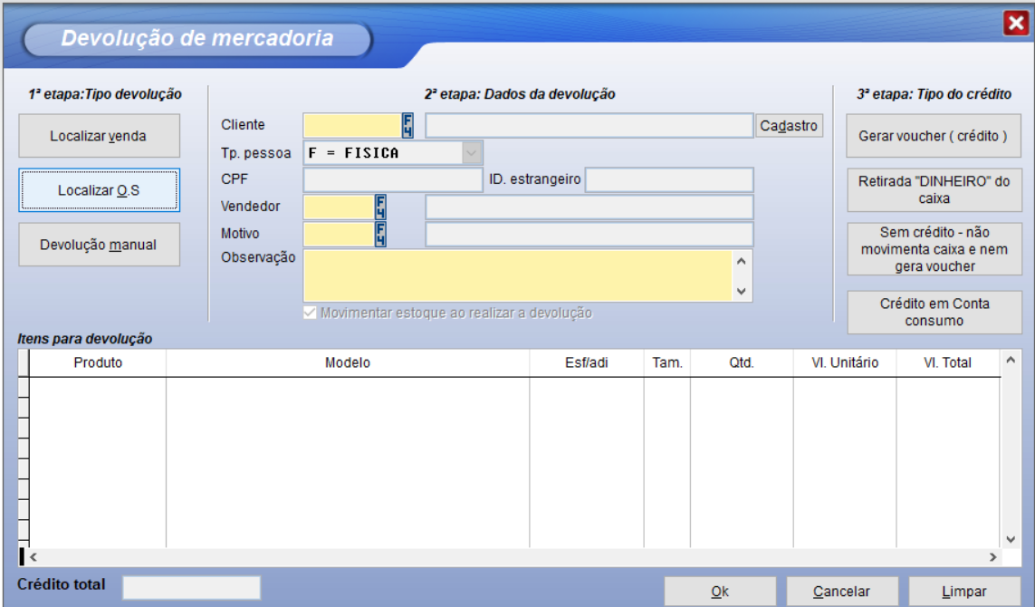 Vixen PDV > Faturamento > Devolução de Mercadoria > Localizar O.S.