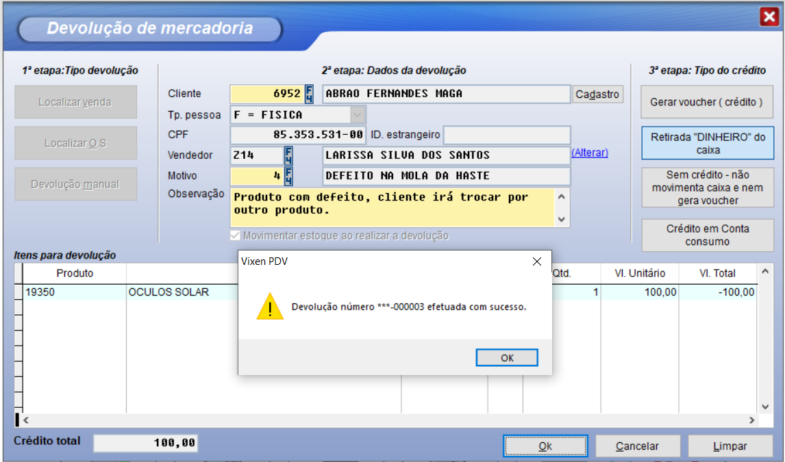 Depois basta escolher o tipo de crédito, para o valor da devolução, sendo: