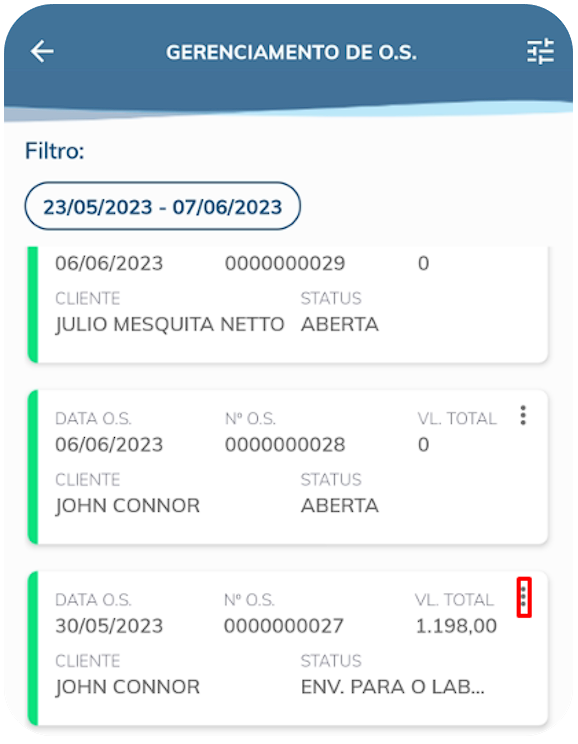 Após isso, na tela que irá se abrir, devemos localizar a ordem de serviço da venda original. Caso não localize, tente alterar os filtros de pesquisa, presente no canto superior da tela. Após localizar a ordem de serviço original, clique na reticencias, presente no canto direito da tela: