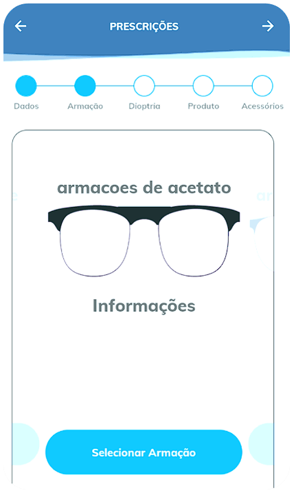 Passando para a etapa “Armação”, vamos selecionar o tipo de armação que vamos adicionar a venda, como por exemplo uma armação de acetato, metal etc.: