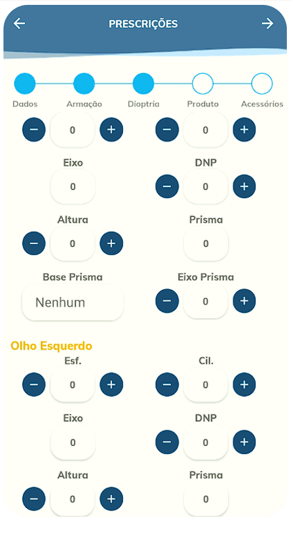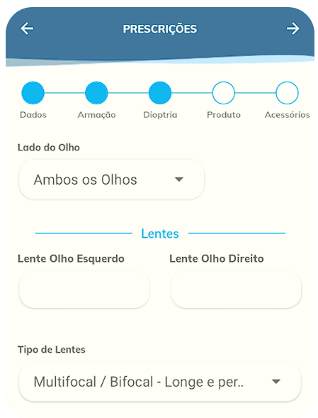 Após selecionar os produtos desejados, podermos partir para a próxima etapa, onde devemos preencher a dioptria da prescrição, baseada na receita entregue pelo cliente: