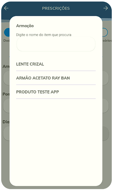Note que, ao clicar no campo “Lente olho esquerdo/direito”, será aberto uma janela, onde será possível selecionar pesquisar o produto que deseja adicionar em sua prescrição: