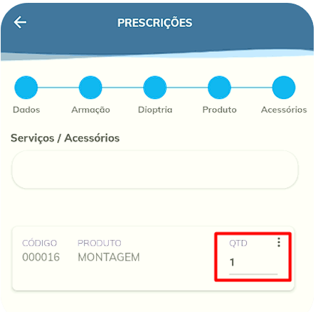 Após selecionar a armação da venda e preencher as especificações do produto, poderemos partir para a última etapa de “Acessórios”. Aqui, poderemos adicionar um acessório a aquela prescrição, como um limpa lentes ou estojo, por exemplo. Ao clicar no campo em questão, será aberta uma janela, onde poderemos escolher o produto que será adicionado na venda. Note que, ao adicionar o acessório, você poderá definir a quantidade daquele determinado produto que será adicionado a venda, conforme vemos abaixo: