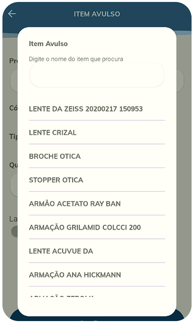 Será aberta uma nova tela, onde será possível incluir um item avulso na venda. Um item avulso, nada mais é do que um produto que não tem relação direta com a prescrição lançada na ordem de serviço. Por exemplo, caso o cliente tenha adquirido um óculos completo (lente e armação), e também um óculos solar. Nesse cenário, o óculos solar seria lançado através da opção “item avulso”.