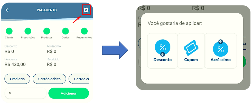 Note que, no canto superior direito da tela, existe um botão, onde através dele, podemos aplicar descontos/acréscimos em nossa venda, conforme vemos abaixo: