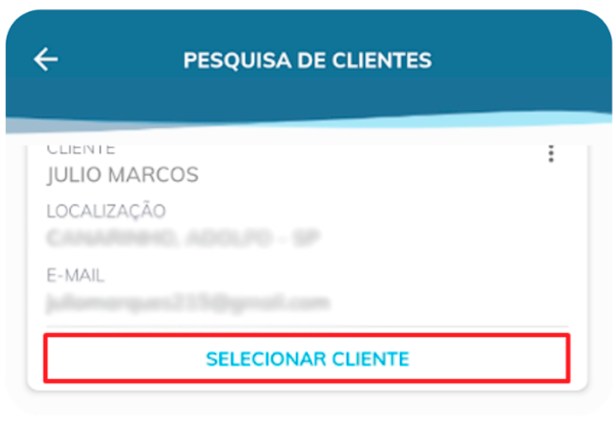 Após preencher seu nome, uma lista de clientes irá aparecer, clientes esses que possuem em seu cadastro o nome pesquisado. Após localizar o cliente deseja, basta clicar em “Selecionar cliente”: