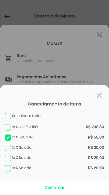 Ao selecionar a mesa e clicar no botão "Cancelamento de item", será aberta em seguida uma tela que irá permitir tirar um item que foi adicionado por engano na venda. Para retirar só é necessário marcar o item e confirmar.