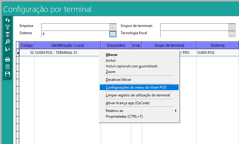 Volpe ERP > Retaguarda Parque > Configurações por Terminal > Botão Direito > Configurações do Menu do Vixen POS