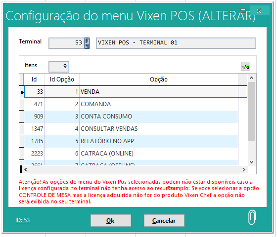 Se você selecionar a opção Controle de Mesa mas a licença adquirida não for do produto Vixen Chef a opção não será exibida no seu terminal.