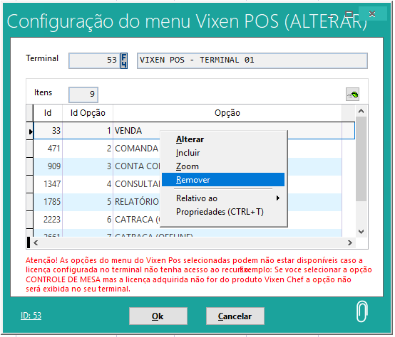 Remover: Remove a opção do menu principal do Vixen POS. Ao clicar em "Remover" e confirmar, a opção será removida da interface do Vixen.