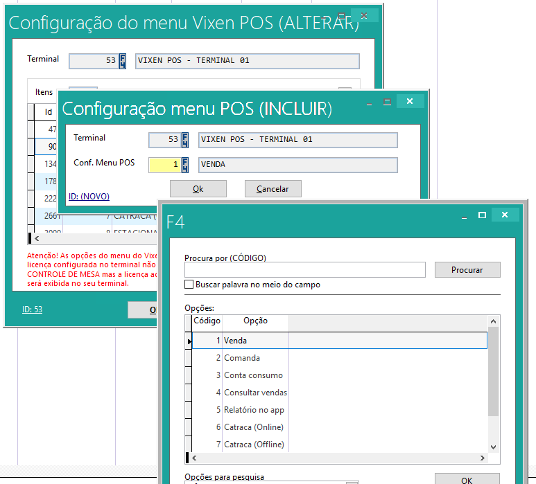 As opções do menu do Vixen POS selecionadas podem não estar disponíveis caso a licença configurada no terminal não tenha acesso ao recurso.