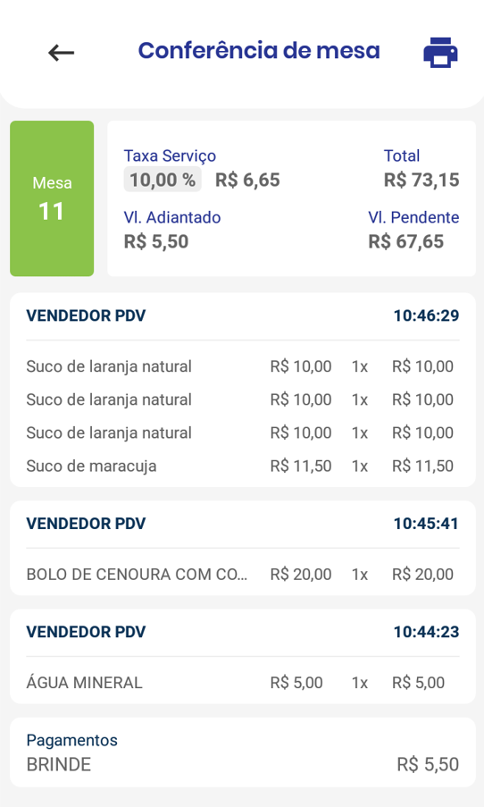 Aqui você terá informações importantes, como: Número da mesa, valor da taxa de serviço, itens, valores adiantados e várias informações.
