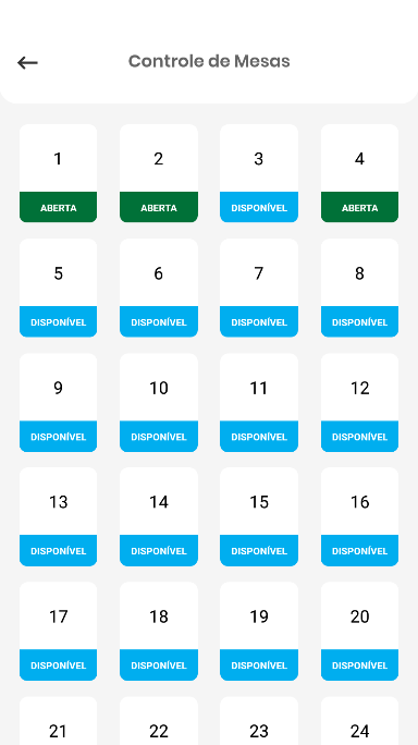 Ao selecionar o menu de controle de mesas, serão exibidas todas as mesas cadastradas no sistema, diferenciando-se entre dois status:
