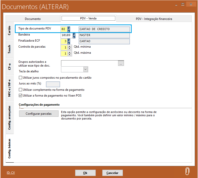 Para que a tela de Dados do Cartão apareça ao selecionar a forma de pagamento, siga para Volpe ERP > Cadastros > Tipos de Documento > PDV Venda > Tipo de Documento PDV.
