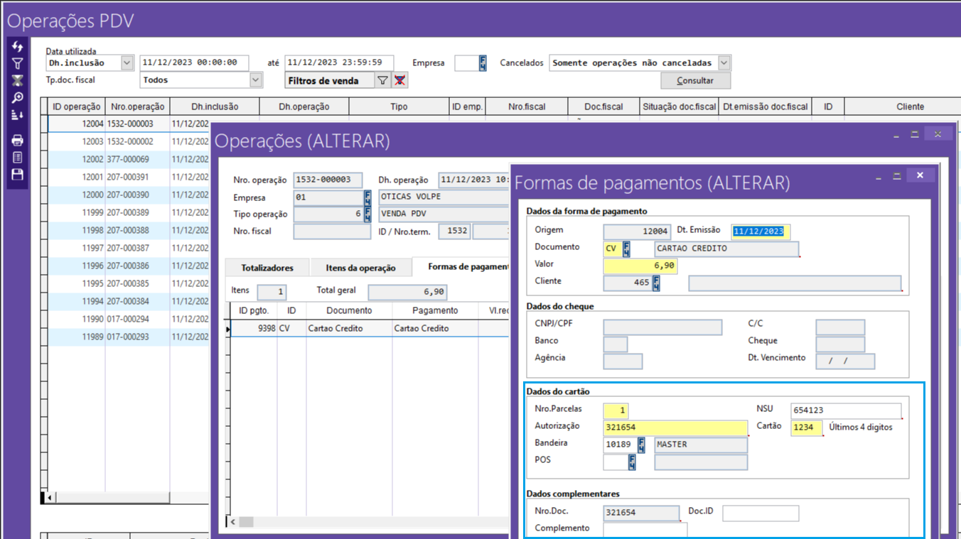 Para visualizar os dados adicionais do cartão em uma venda, siga para Volpe ERP > Retaguarda Parque > Operações PDV > Zoom > Forma de Pagamento > Zoom.