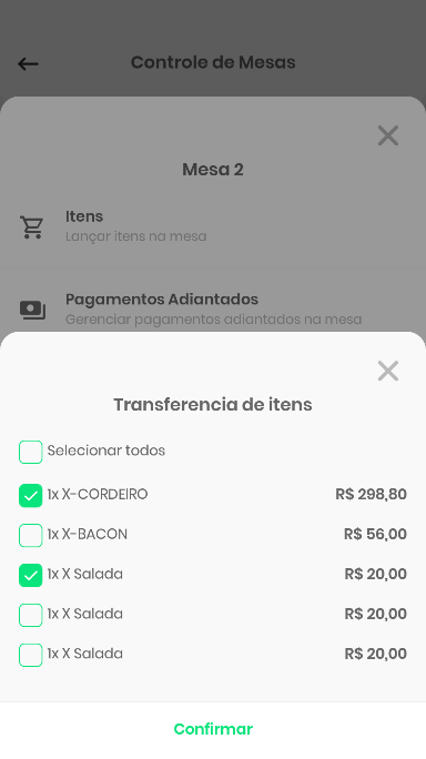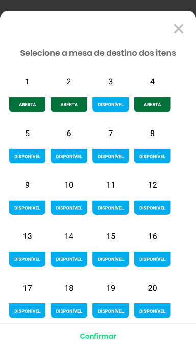 Após selecionados os itens e clicar em “Confirmar” ele irá pedir para selecionar a mesa de destino dos itens: