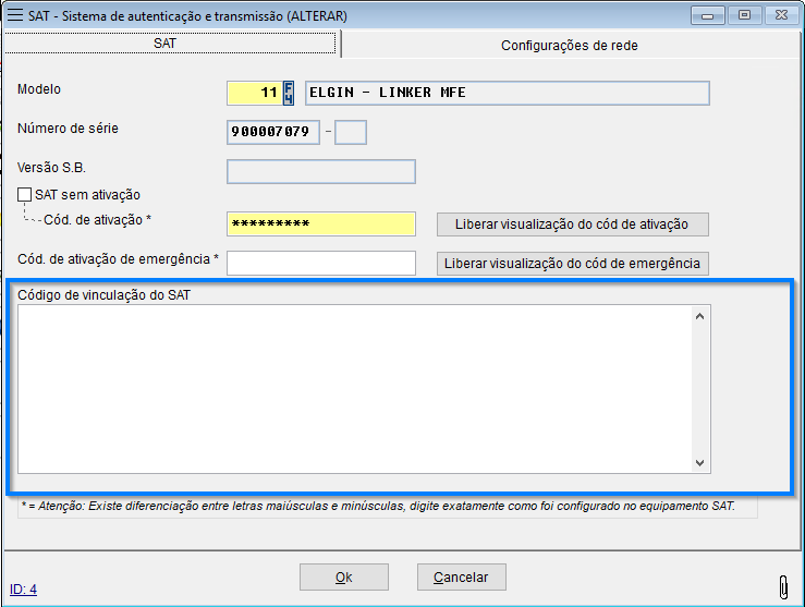 Selecione o SAT que será utilizado no serviço e preencha a informação do CÓDIGO DE VINCULAÇÃO DO SAT.