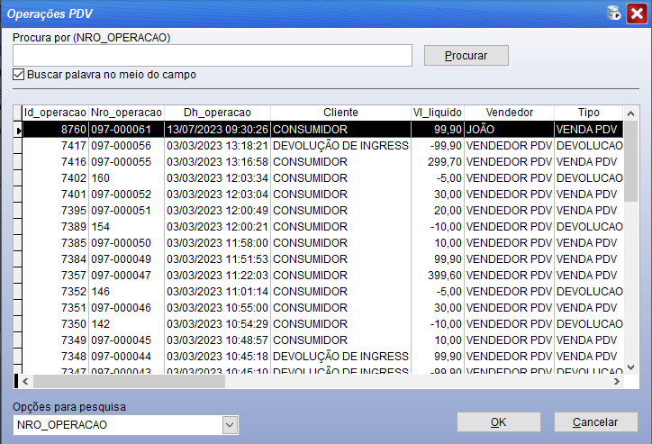 Na tela a seguir, consulte as informações da venda para localizá-la. Clique na venda que necessita cancelar, e em seguida em “OK”.