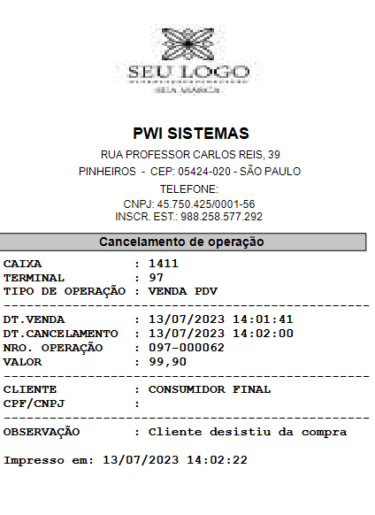 É possível, se necessário, limitar o acesso a esta tela por usuário e senha. Ou seja, apenas alguns usuários poderão cancelar vendas.