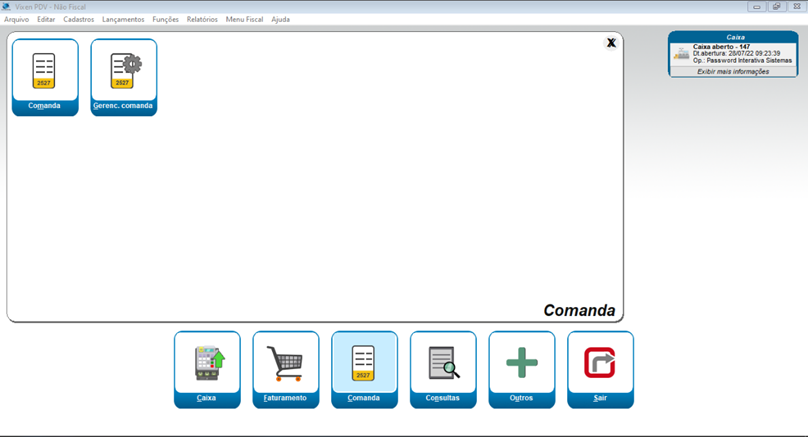 Na tela inicial do Vixen clicaremos no botão “Comanda” e seguiremos para a opção “Comanda”.