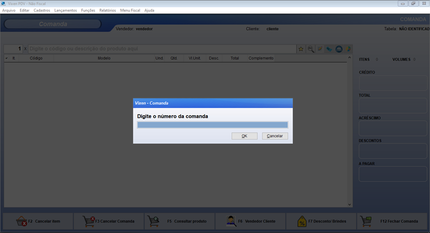 Ao clicarmos no botão indicado acima o sistema irá solicitar um número de comanda que será utilizado, caso seja informado um número de comanda que ainda não exista será aberto uma comanda nova.