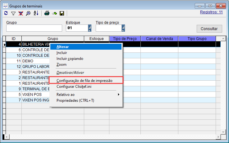Após cadastrar as filas de impressão, é necessário acessar a tela "Retaguarda Parque" > "Grupos de terminal" > Botão direito > "Configurar fila de impressão":