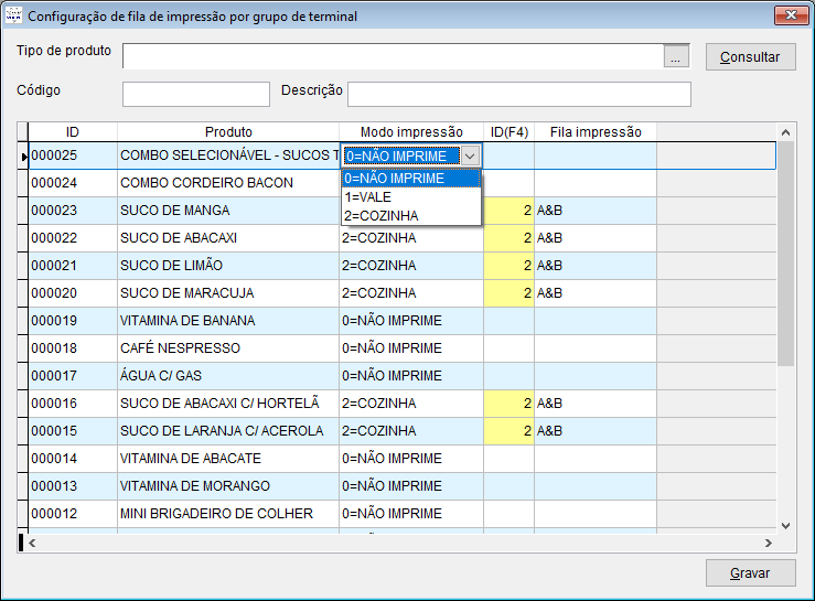 1 = VALE: O produto não será impresso na cozinha, e no momento da venda no PDV, será impresso um comprovante de vale retirada, para que o item possa ser retirado a qualquer momento pelo cliente;